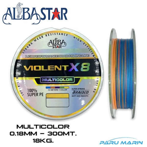 Albastar Violent 8x kat örgü ip misina hem tatlı su, hem deniz suları için çok yönlü olarak üretilmiştir. Albastar Violent derinliği ölçebileceğiniz multicolor renge, ultra ince, sıkı örgülü bir yapıya ve süper güçlü polietilen liflere sahiptir. Su itici ve hızlı batma özelliğe sahiptir. Yuvarlak gövdeli, aşınmalara karşı dayanıklı, yüksek mukavemet ve düğüm gücü, yüksek hassasiyetli sekiz kat örgü ip misinadır.