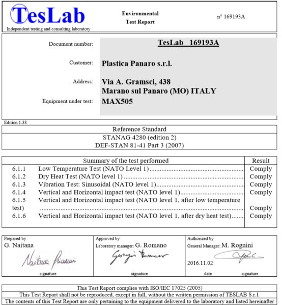 Panaro Max serisi sızdırmaz çantalar IP67 Koruma sınıfında olup toz ve su geçirmezdir. Darbelere dayanıklıdır. Nato Level 1 testlerinin tamanını geçmiştir.