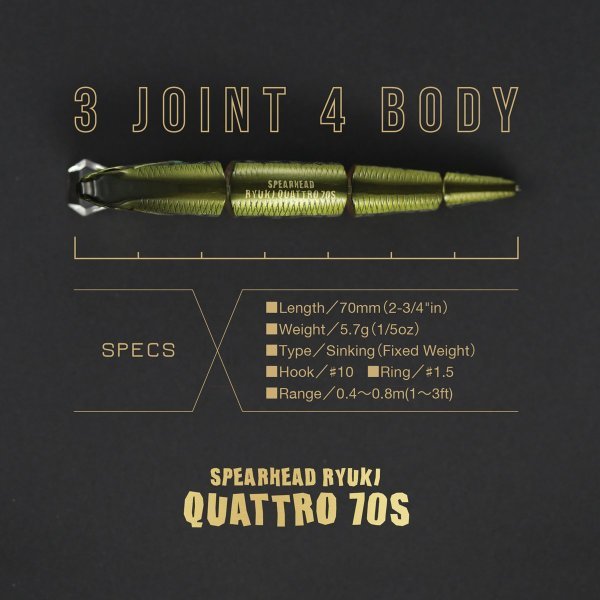 Ryuki birçok balık türü için ayrıcalıklı aksiyonlar sergilerken, yeni Spearhead Ryuki 70S Quattro da alabalık avcılığının ötesinde geniş bir uygulama alanı bulacaktır. Alabalık avcılığında son noktayı koymak için, Spearhead Ryuki Yeni Quattro ile öncülük edin!